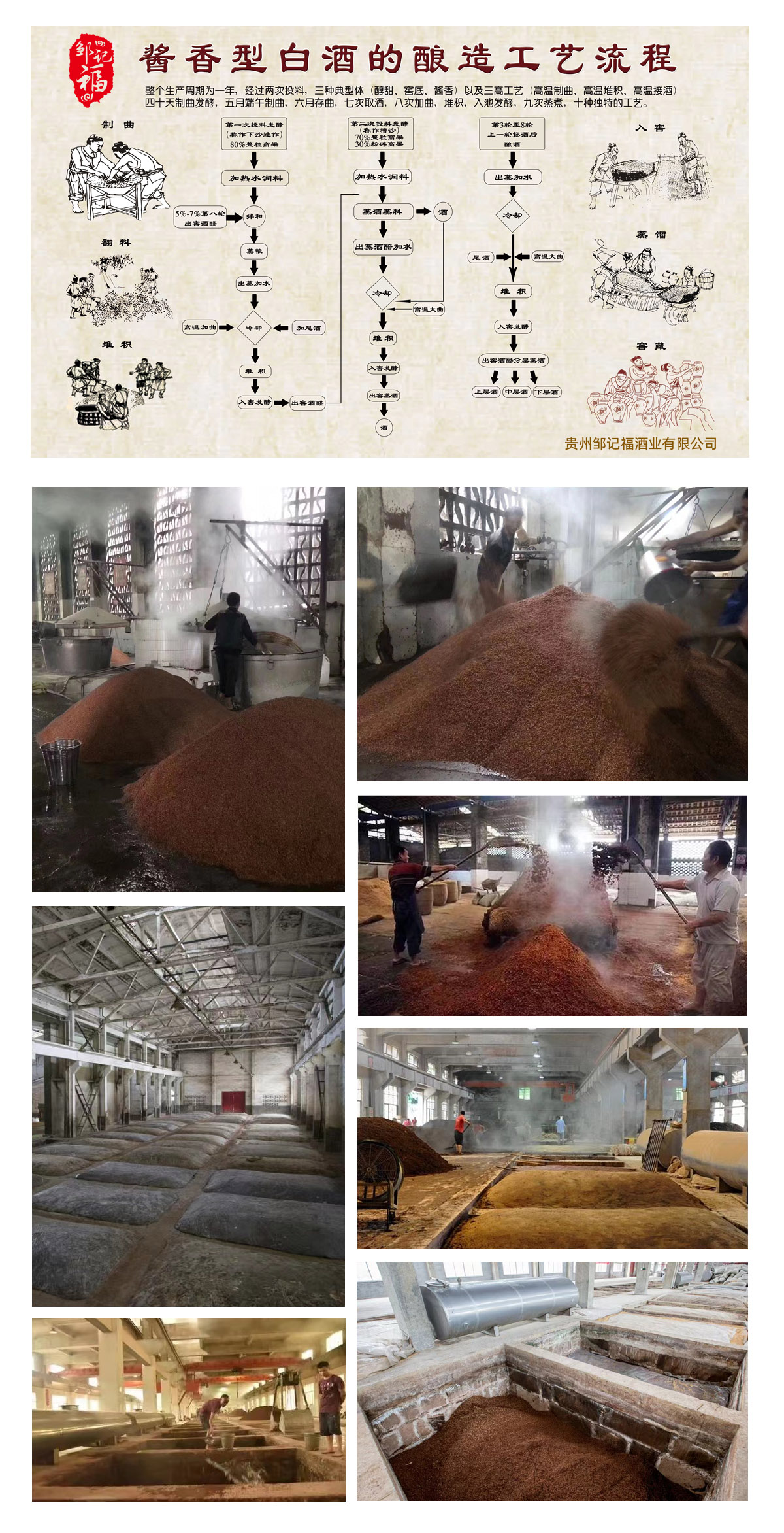 01 1年一个生产周期 酱香酒的生产周期为一年,这一年中从端午节开始制曲,制曲要经过踩曲、入仓、翻曲、存曲等过程,一块合格的酒曲起码耗时8个月;到重阳节前后开始下沙(投粮),随后再经历九次蒸煮、八次发酵、七次取酒一系列流程,直到第二年中秋前后才结束。 02 2次投料 初次下沙,二次糙沙。酱香酒每年(即一个生产周期内只投粮两次),即下沙和糙沙各一次,在以后的酿造环节中不再投入新的粮食,只将酒醅反复发酵和蒸煮。 03 三种典型酒体 优质酱香酒有三种典型酒体,即窖底香、醇甜香、酱香,只有具备这三种典型酒体的酱酒,才是优质酱香酒。 04 四十天制曲发酵 酱香酒的制曲工艺也是其独特之处,需要用人工踩曲,踩成四周紧,中间松,而且中间隆起的龟背形,再移入发酵间进行发酵,发酵时间长达四十天。 05 每年五月端午制曲 端午时节气温开始升高,微生物活动也开始活跃起来,其时制作酒曲最合适,酒曲能够最大限度地富集微生物,有助于制作优质酒曲,为后续酿酒提供坚实基础。 06 六个月存曲 酱香酒发酵好之后要在曲房中存放长达六个月时间,只有存放足够长的时间,酱酒中的微生物才能富集更好,也更成熟,为酱酒提供更丰富优质的香气。 07 7次取酒 酱香酒第一、二次蒸煮不取酒,真正的取酒要到次年的一月份才开始进行,共有七次,每次的风味也都不一样。 第1次蒸馏出的酒称为糙沙酒,生涩、略有生粮味和酸味; 第2次发酵后取出蒸馏的酒称为回沙酒,醇和、略有涩味; 第3、4、5次酒称为大回酒,酱香突出,味醇厚,酒体丰满,出酒率高; 第6次的酒称为小回酒:酱香明显,后味长,有焦香味; 第7次的酒称为尾糟酒:醇和、焦香味重,微苦。 七次取酒中,三至第五次取出的酒最好,不过每一次取出的酒都有用处,每一瓶成品酒都需要经过不同批次酒之间的勾调,以酒调酒,让酱香酒的酒质、味道、口感更加协调。 08 8次发酵 酱香酒在酿造过程中,要经历8次反复发酵,每次发酵都有阴阳两种发酵方式,即经历高温堆积发酵后再封入窖池进行封存发酵。反复发酵能培育更多更丰富的微生物群,从而能更好地促进糖化酶的转化,酿造更好的酱香风味。 09 9次蒸煮 酱香酒之所以必须采用红缨糯高粱做原料,就因为它是唯一能经得起九次蒸煮的高粱,而其它高粱蒸煮一两次就取不出酒了。 九次蒸煮的过程:首次下沙后清蒸一次,糙沙混蒸一次,前两次蒸煮变成酿成而未过滤的酒,再进行第三次蒸煮,得到熟糟。熟糟再经过摊凉、撒曲、堆积、下窖、封窖发酵、开窖取碚醅、蒸酒六个轮次的循环,每个环节中都有一次蒸煮,整个过程共有九次蒸煮。 简单的9个数字,却是酱香酒反复繁杂长达一年的酿造流程,而这其中还有诸多讲究,每个环节每个细节都不容差池。 经过以上九步工艺酿造好的新酒,还需放入窖藏基地进行五年以上的时间沉淀,再经勾酒师傅们的悉心勾兑和严格检验。到最终灌装上市,期间至少要经历5年时间。 正是这些繁杂的过程和耗时的打磨,才使得酱香酒成为中国白酒塔尖的美酒。这样的美酒,又怎能让人拒绝呢?